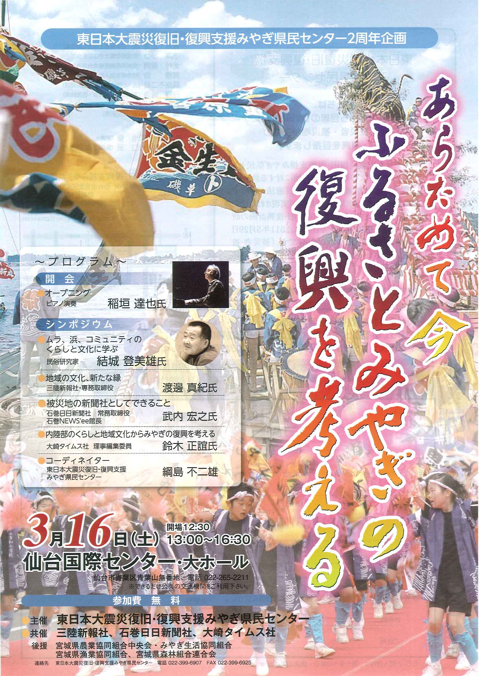 まもなく震災から2年を迎えますが、当事務所の菊地弁護士が事務局長を務め、2011年5月29日に設立された東日本大震災復旧・復興支援みやぎ県民センターでは、設立2周年企画として「あらためて、今、ふるさとみやぎの復興を考える」と題したシンポジウムを開催致します。