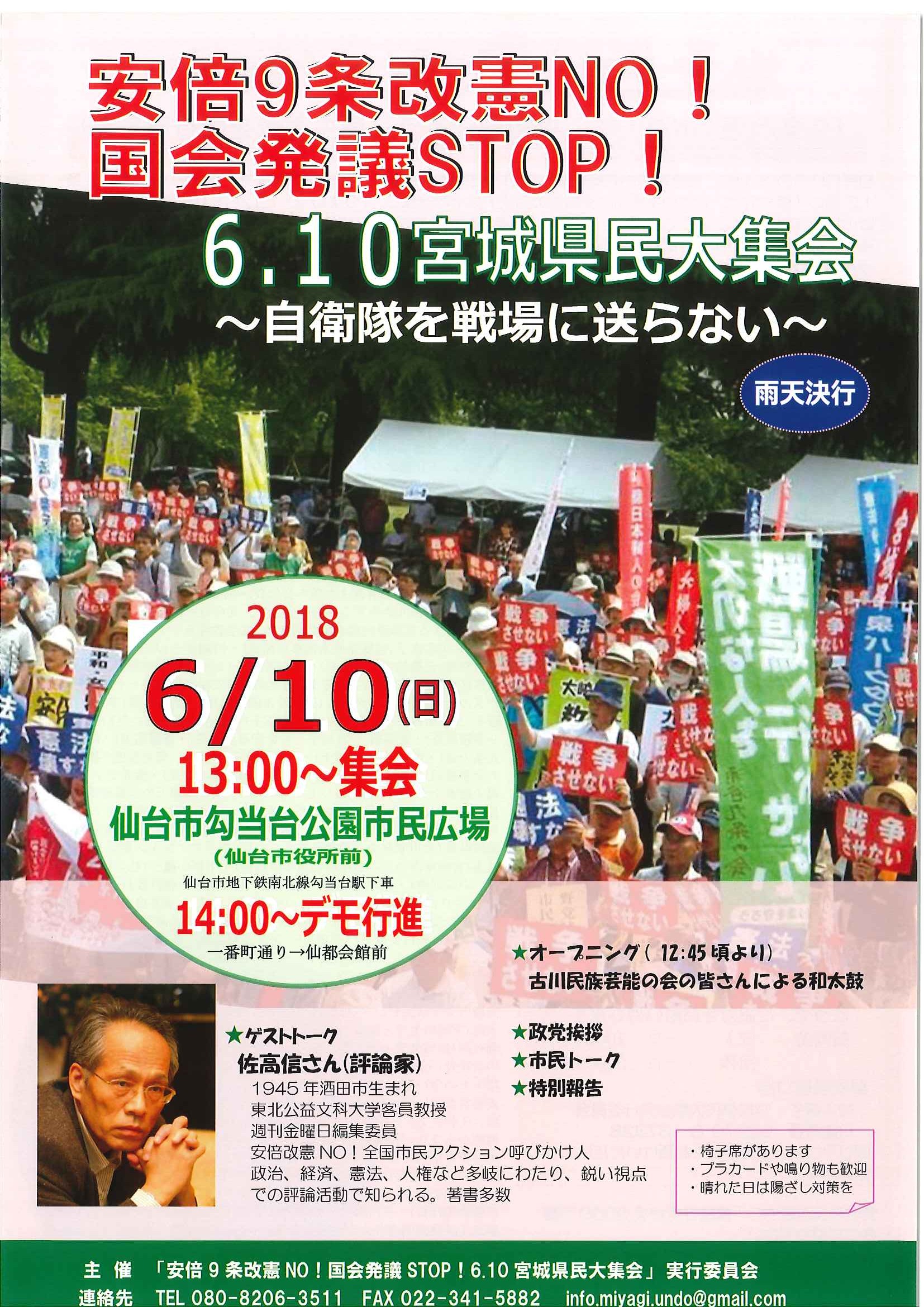 【集会のお知らせ】6.10宮城県民大集会~自衛隊を戦場に送らない~【日時:6月10日(日)13:00~(集会) 14:00~(デモ行進) 場所:仙台市勾当台公園市民広場(仙台市役所前)】 2018/05/15