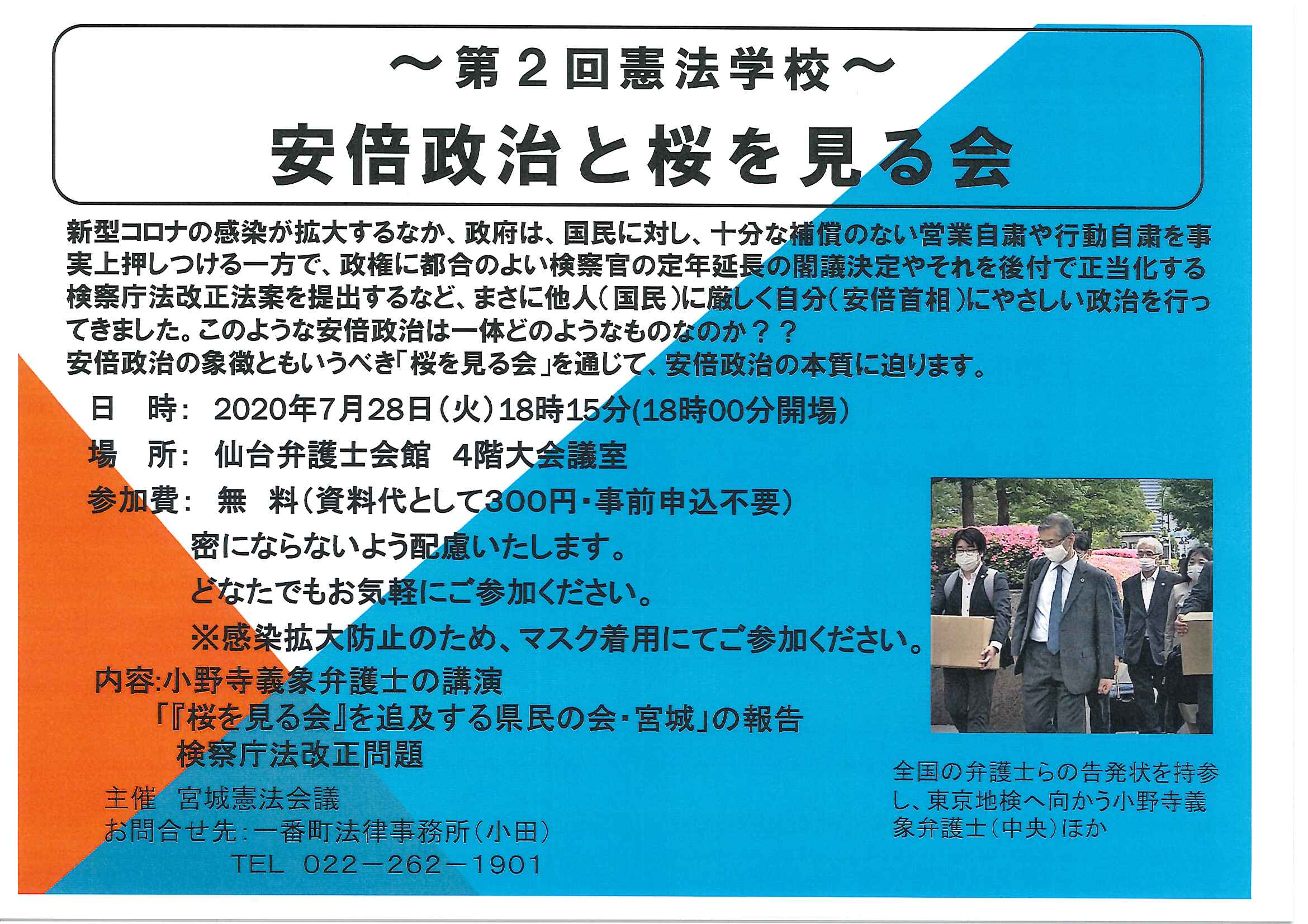 【第2回憲法学校】安倍政治と桜を見る会 2020/07/22 宮城憲法会議主催の憲法学校が、7月28日(火)午後6時15分に仙台弁護士会館4階で行われます。 当事務所の小野寺義象弁護士が、安倍首相の「桜を見る会・前夜祭」問題について講演します。 ぜひ、ご参加ください。