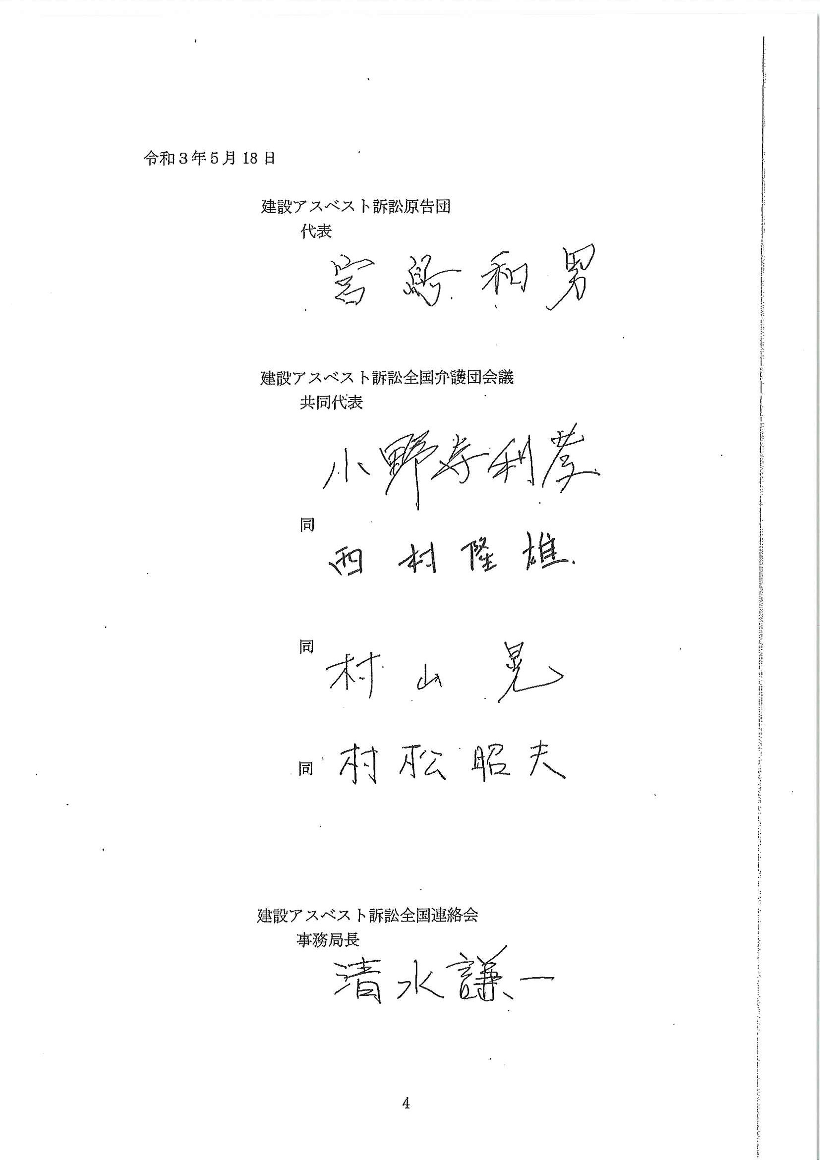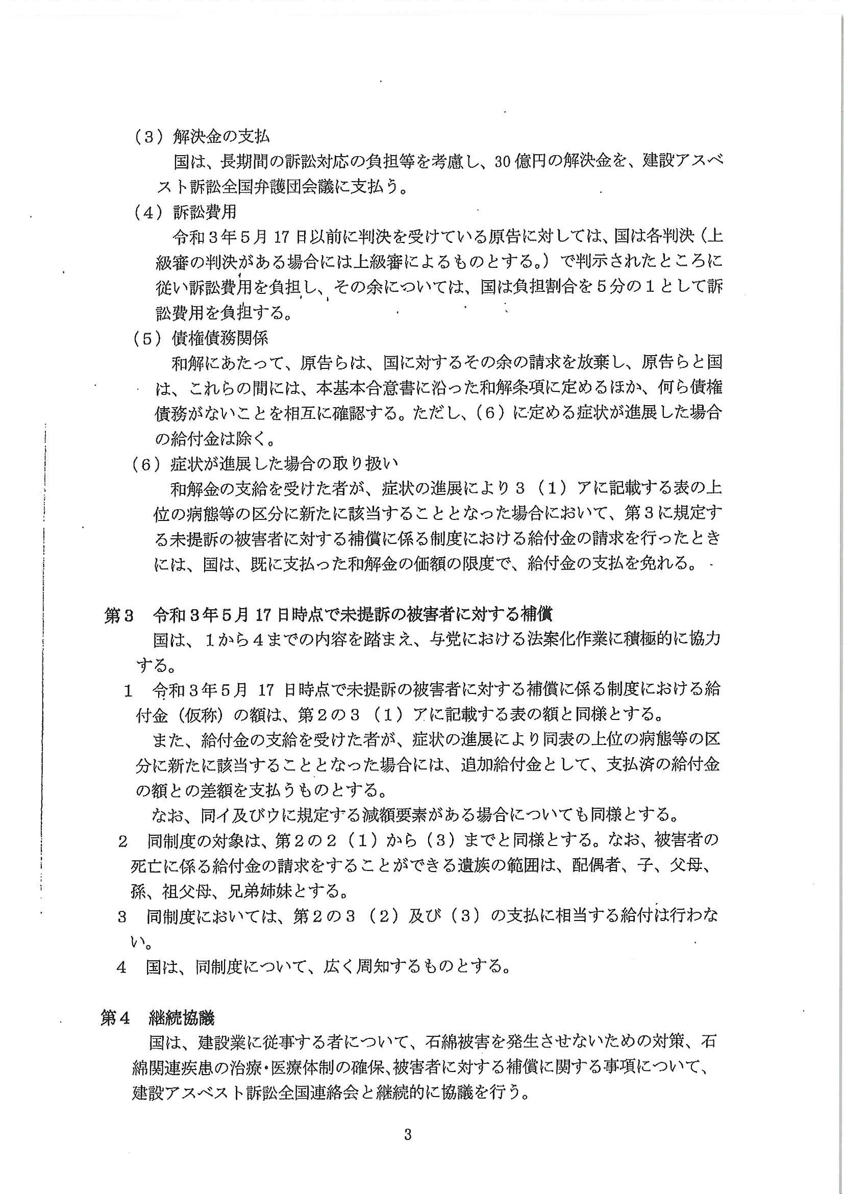 今年(21年)5月17日、建設アスベスト被害救済を認めた最高裁判決の言渡しがあり、翌18日には、建設アスベスト訴訟原告団、弁護団会議及び全国連絡会と国(厚生労働大臣)の間で、被害救済の画期的な基本合意書(別紙をご覧ください)が締結され、6月9日には、被害給付金支給法が国会で成立しました。