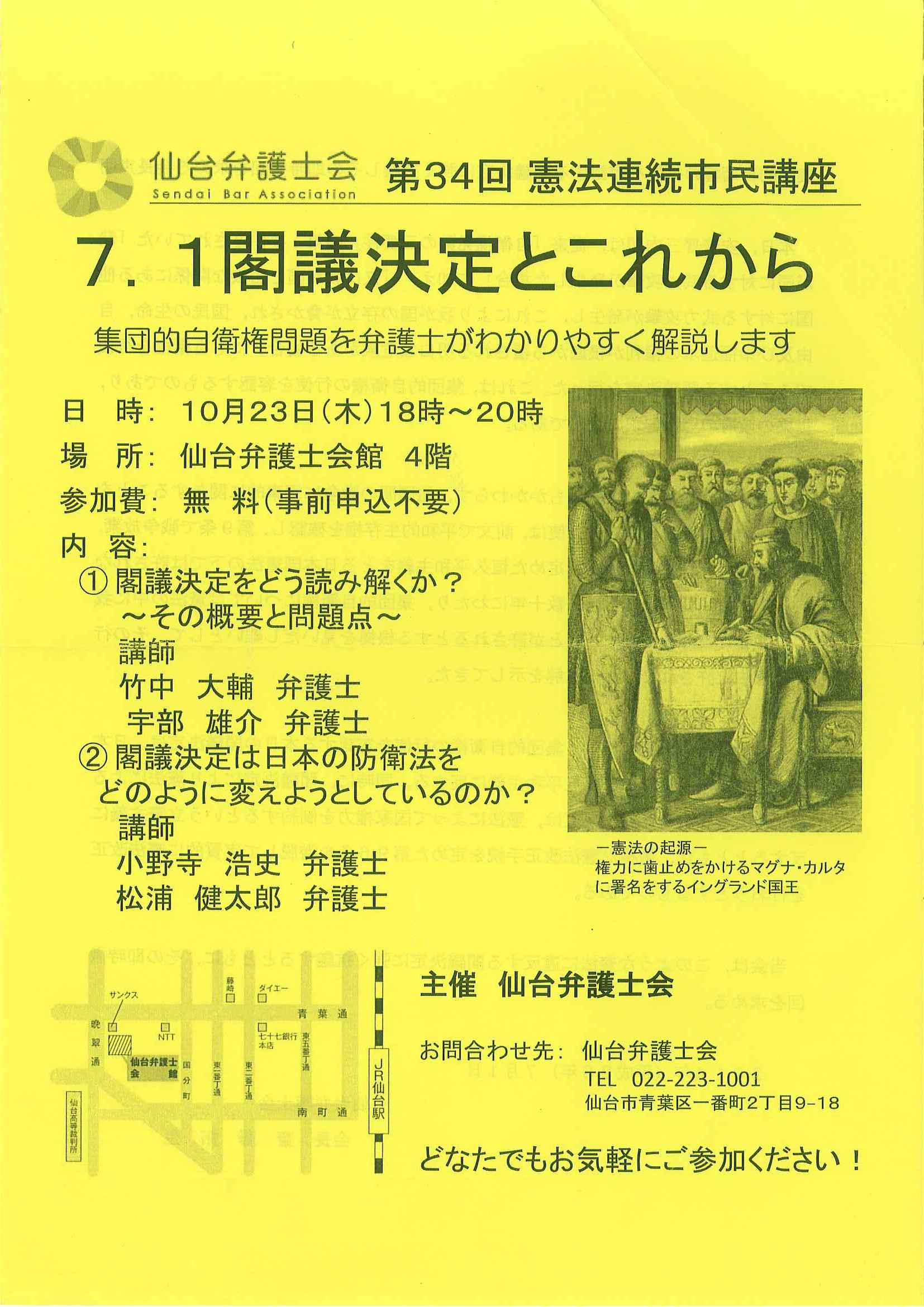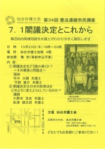 仙台弁護士会では、10月23日にこの集団的自衛権問題を4人の若手弁護士がわかりやすく解説する市民講座(無料)を行います。