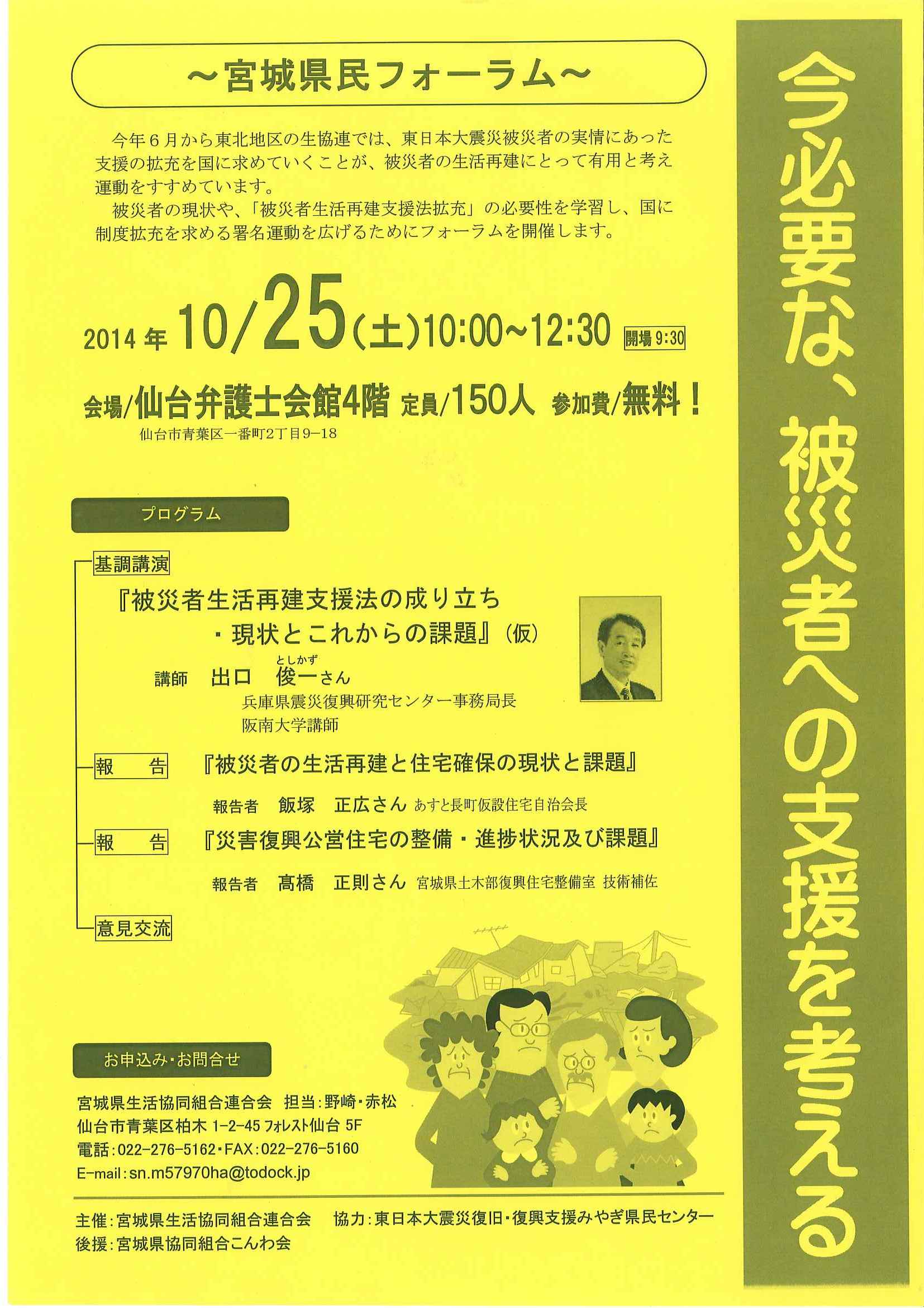 東日本大震災の被災者の現状や、「被災者生活再建支援法拡充」の必要性を学習し、国に制度拡充を求める署名運動を広めるためのファーラムが開催されます。
