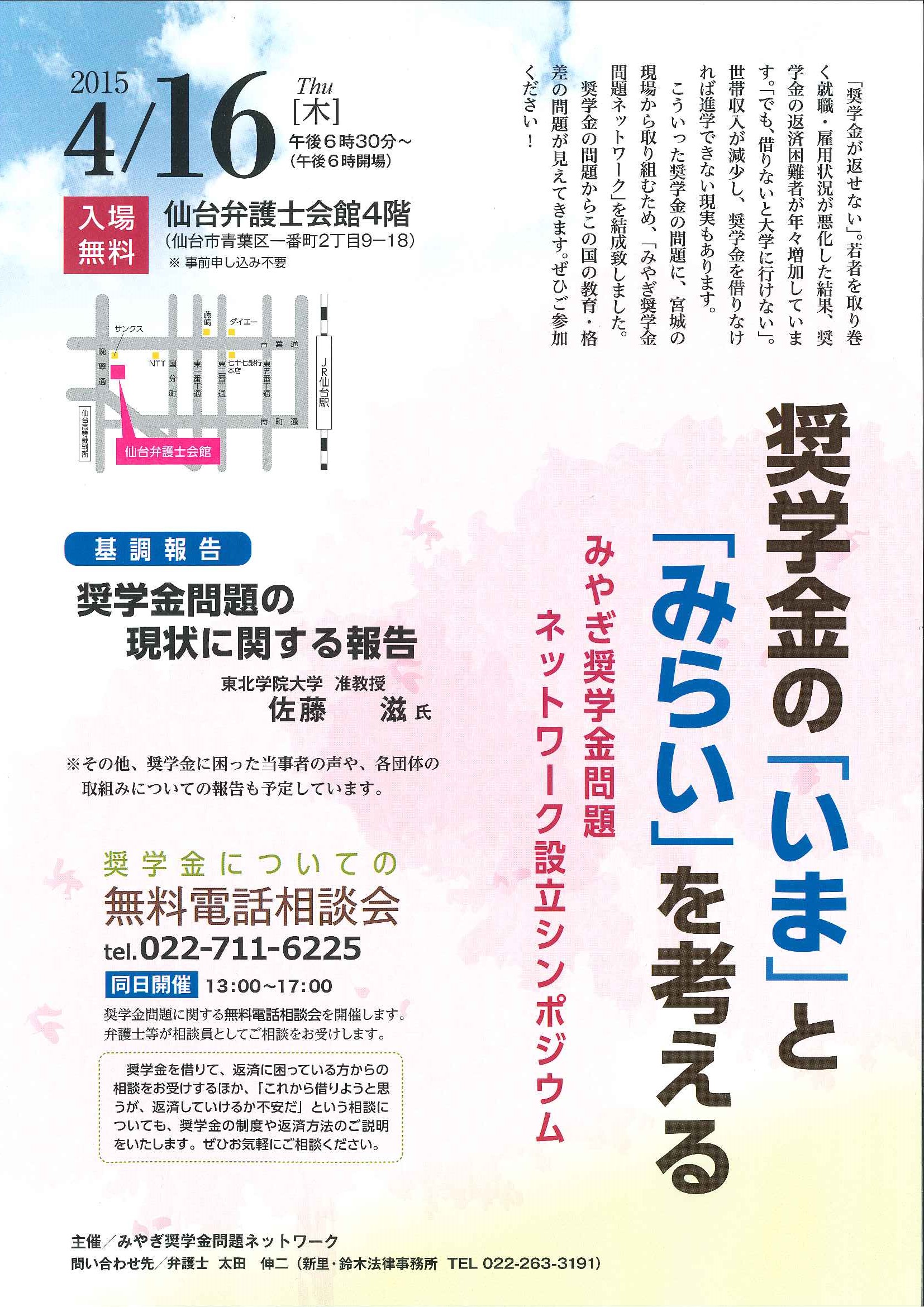 【イベントのお知らせ】奨学金の「いま」と「みらい」を考える-みやぎ奨学金問題ネットワーク設立シンポジウム- - 仙台 弁護士 一番町法律事務所