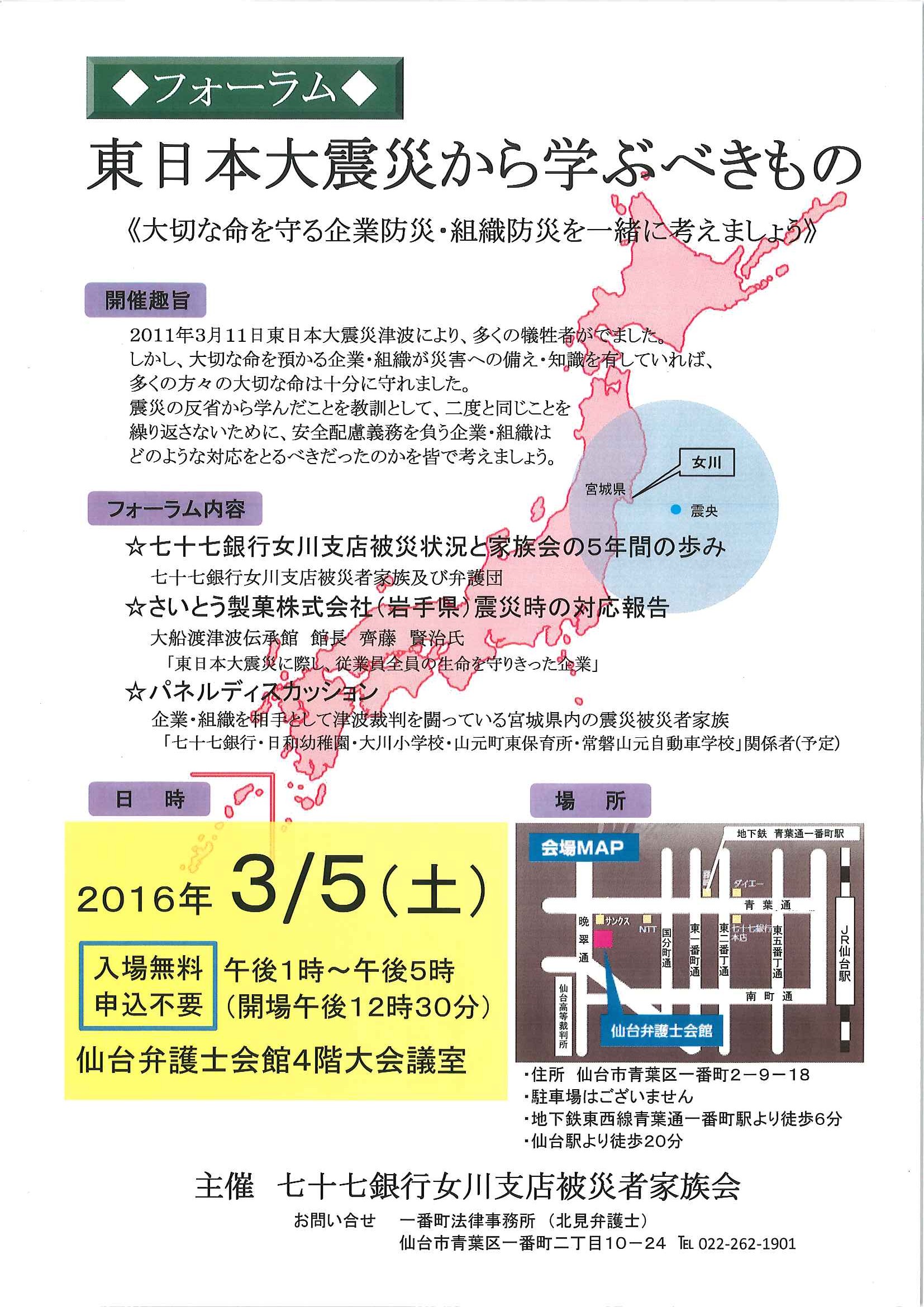 【フォーラムのお知らせ】東日本大震災から学ぶべきもの≪大切な命を守る企業防災・組織防災を一緒に考えましょう≫【3月5日午後1時~5時,仙台弁護士会館4階】 - 仙台 弁護士 一番町法律事務所