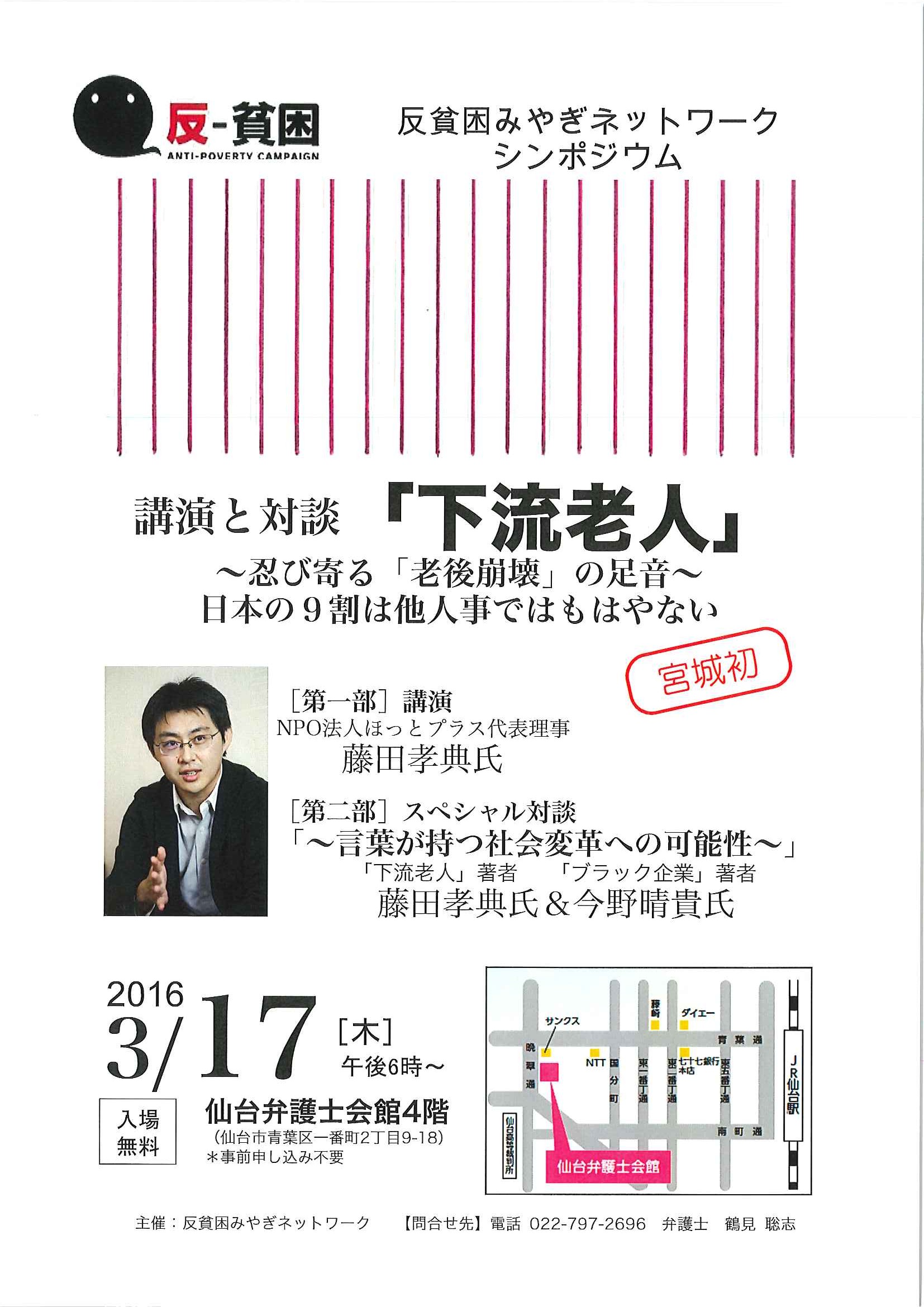 【シンポジウムのお知らせ】講演と対談「下流老人」~忍び寄る「老後崩壊」の足音~日本の9割は他人事ではもはやない【2016年3月17日(木)午後6時~仙台弁護士会館4階】