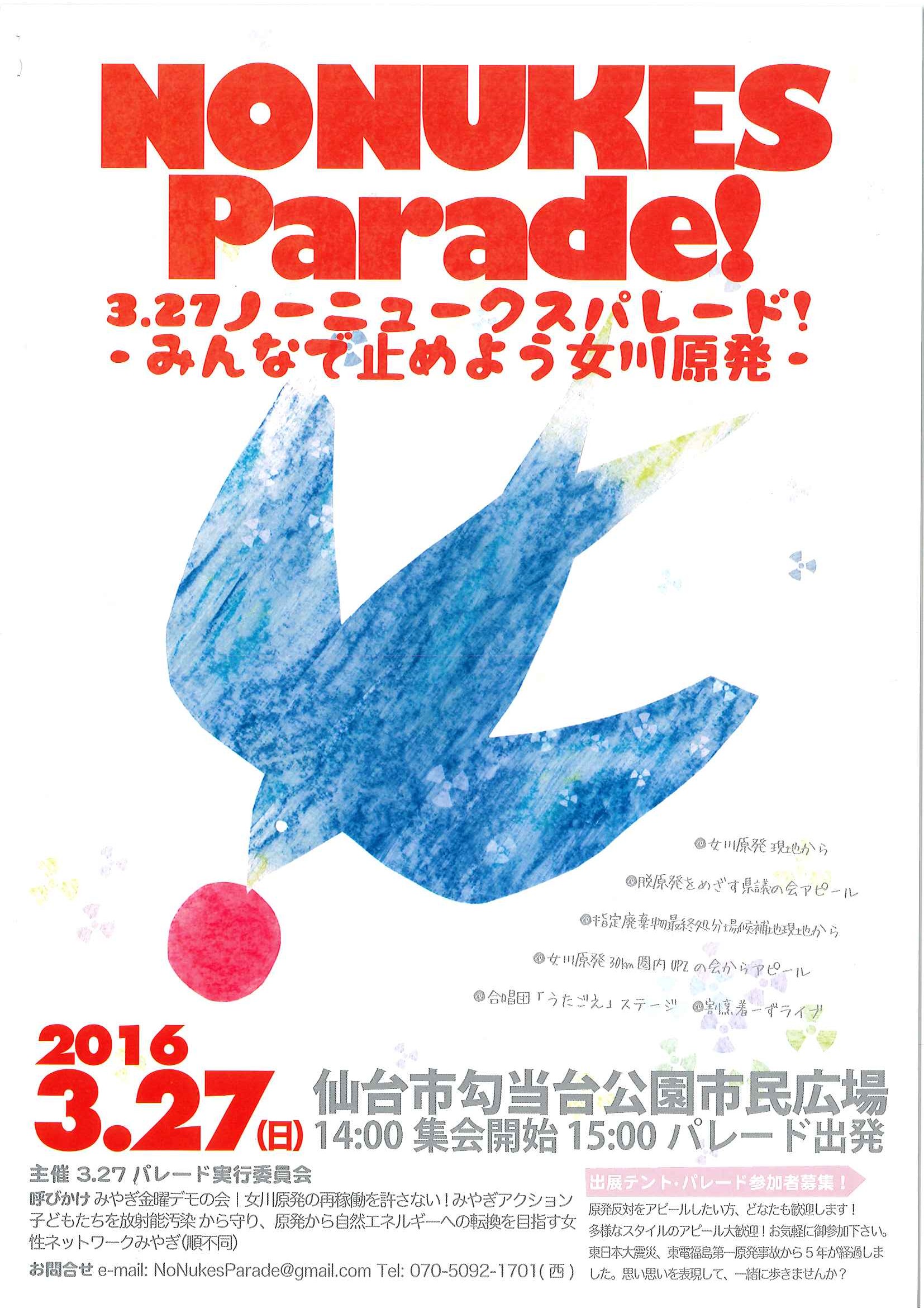 【パレードのお知らせ】3.27ノーニュークスパレード!-みんなで止めよう女川原発【3月27日(日)14:00集合開始 15:00パレード出発,仙台市勾当台公園市民広場】