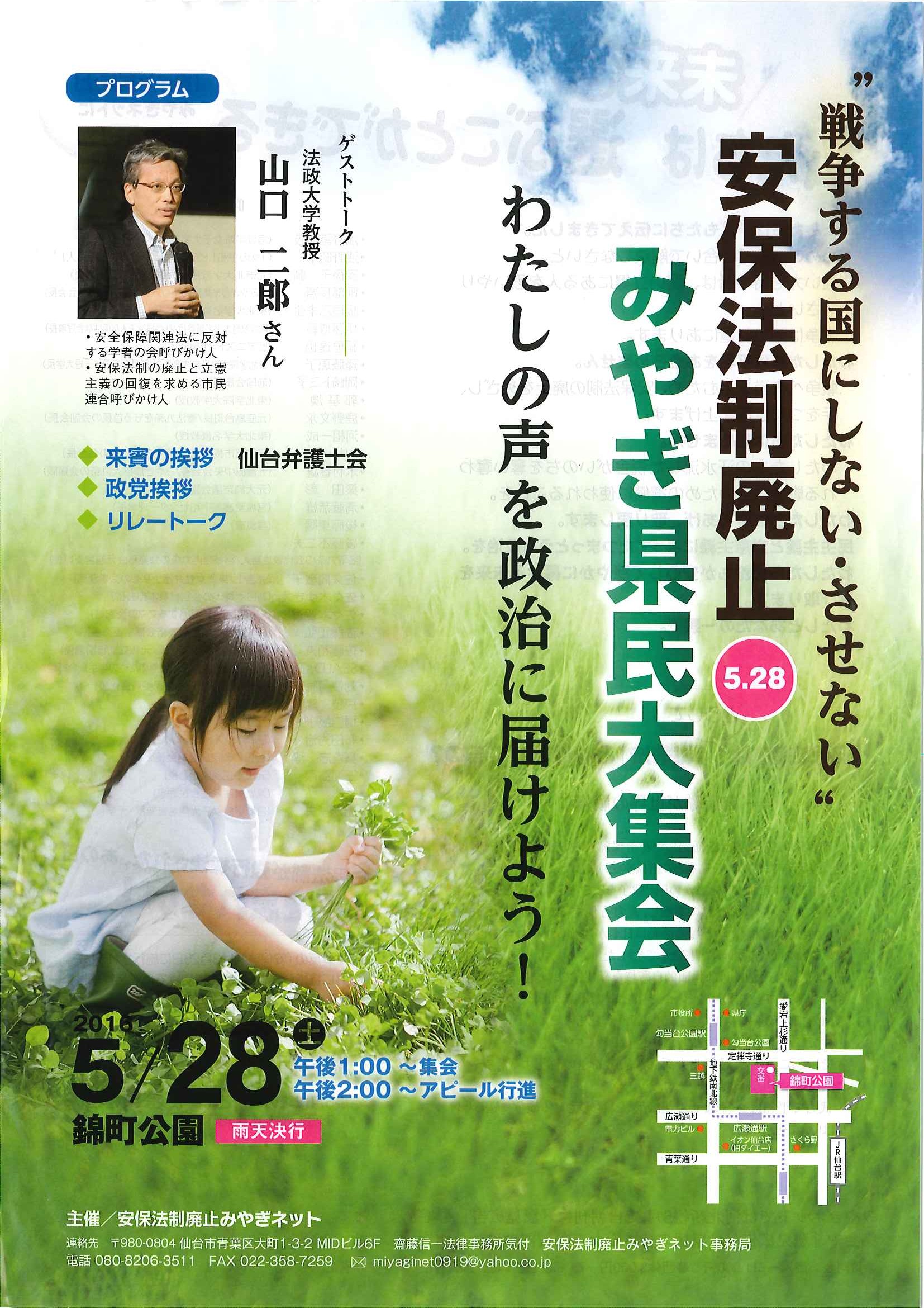 【集会のお知らせ】″戦争する国にしない・させない″安保法制廃止5.28みやぎ県民大集会【5月28日(土)午後1:00~集会 午後2:00~アピール行進 場所:錦町公園 雨天決行】 - 仙台 弁護士 一番町法律事務所