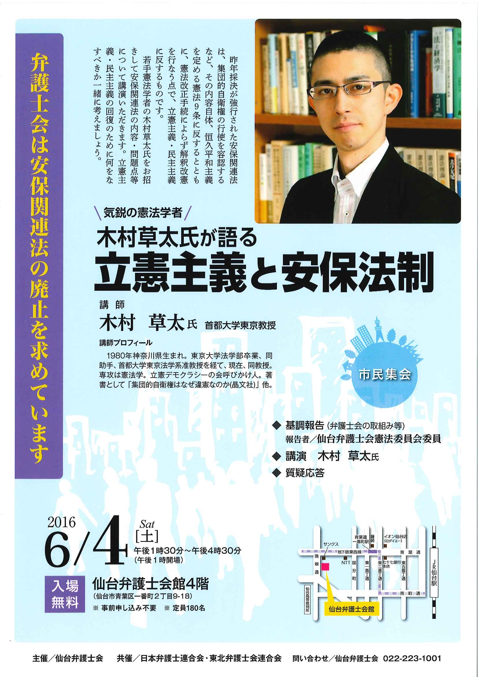 【シンポジウムのお知らせ】木村草太氏が語る立憲主義と安保法制【6月4日(土)午後1時30分~午後4時30分 仙台弁護士会館4階】
