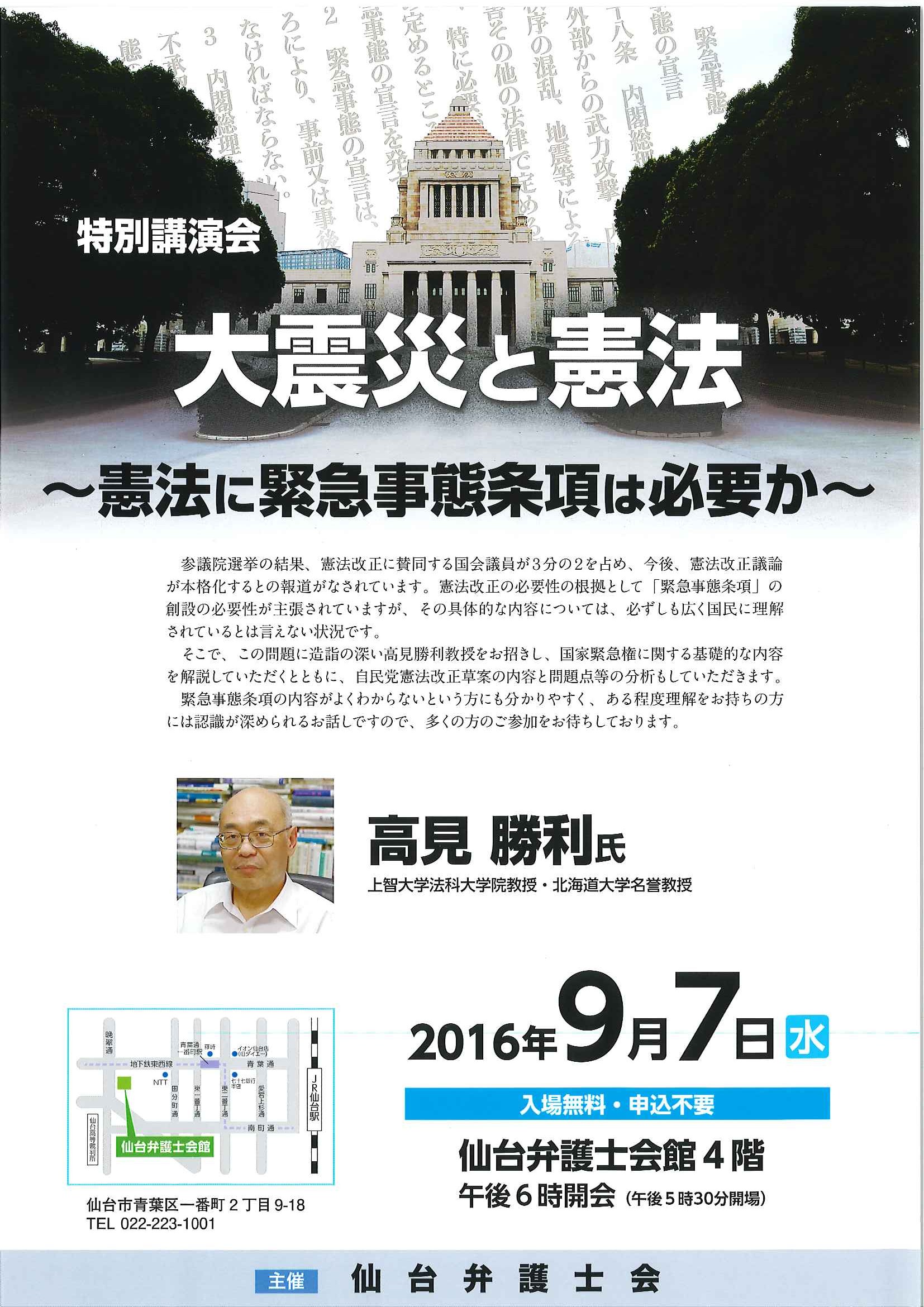 【講演会のお知らせ】大震災と憲法~憲法に緊急事態条項は必要か~【9月7日(水)18:00~(17:30開場) 仙台弁護士会館4階】 - 仙台 弁護士 一番町法律事務所