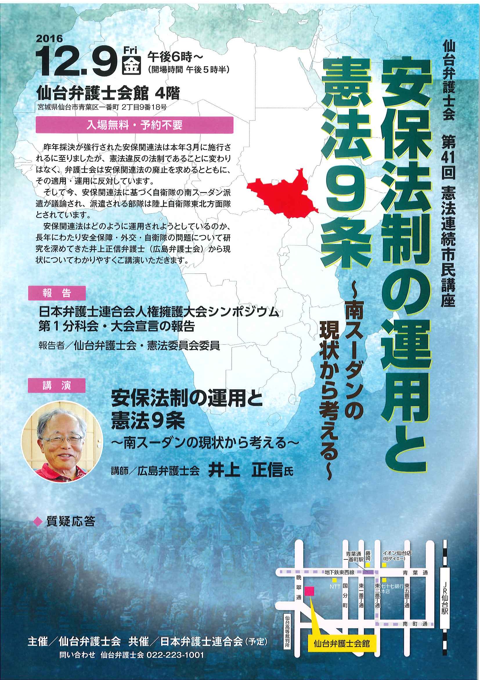 【講演のお知らせ】仙台弁護士会第41回憲法連続市民講座 安保法制の運用と憲法9条~南スーダンの現状から考える~【日時2016.12.9(金)午後6:00~ 場所:仙台弁護士会館4階】 2016/11/11