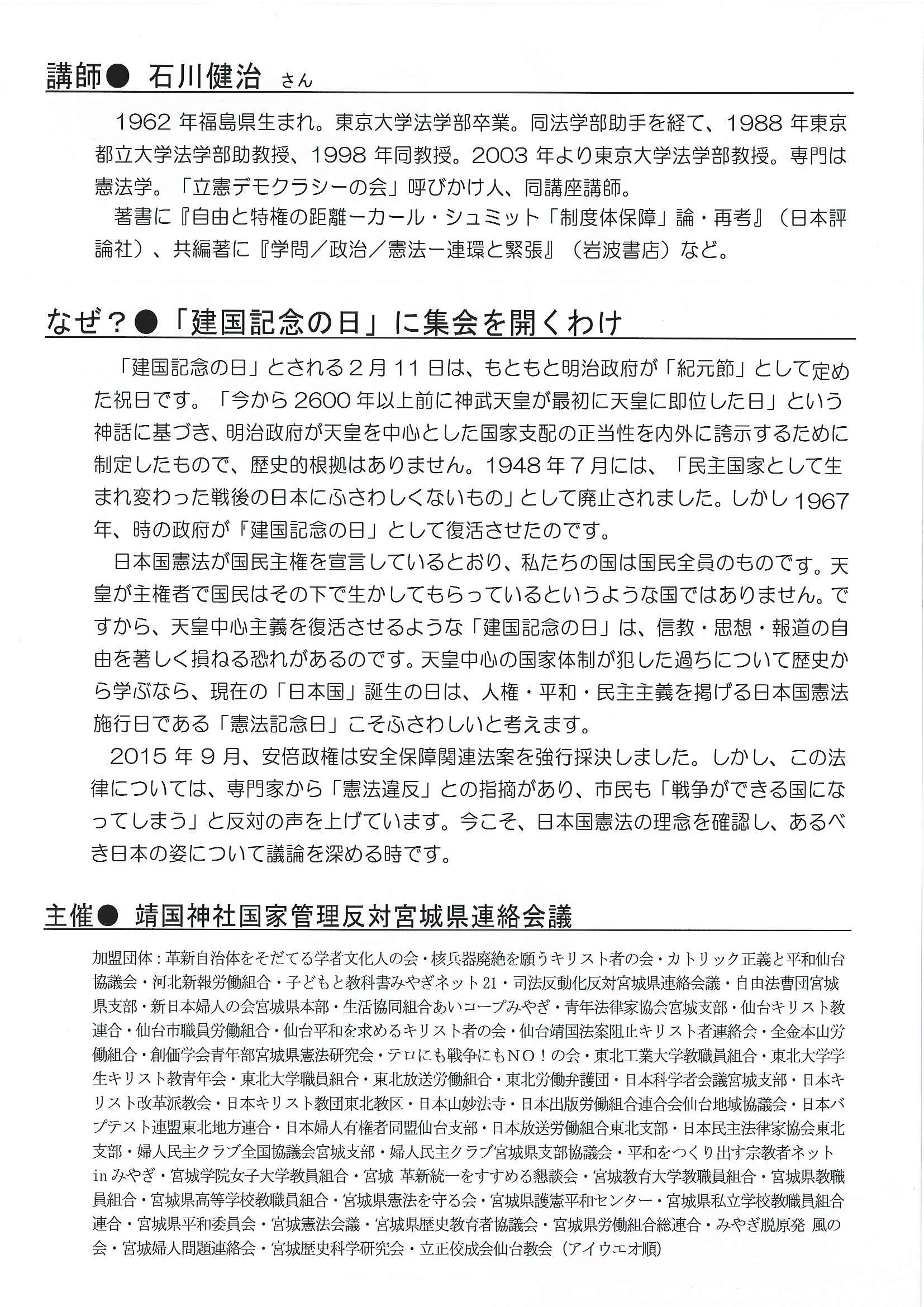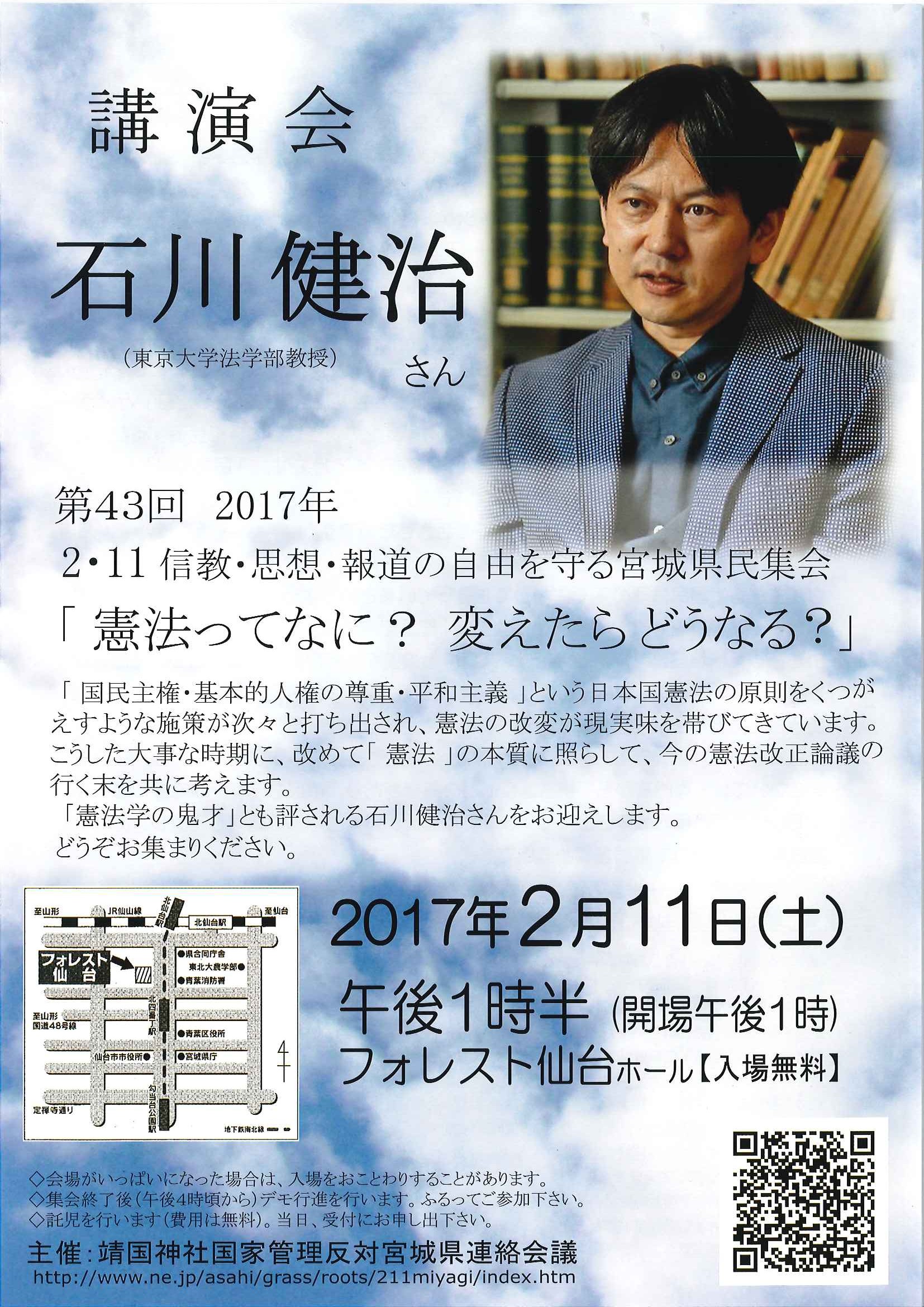 【講演会のお知らせ】第43回 2017年 2・11信教・思想・報道の自由を守る宮城県民集会「憲法ってなに?変えたらどうなる?」【日時:2017年2月11日(土)午後1時半 場所:フォレスト仙台】 2016/12/19