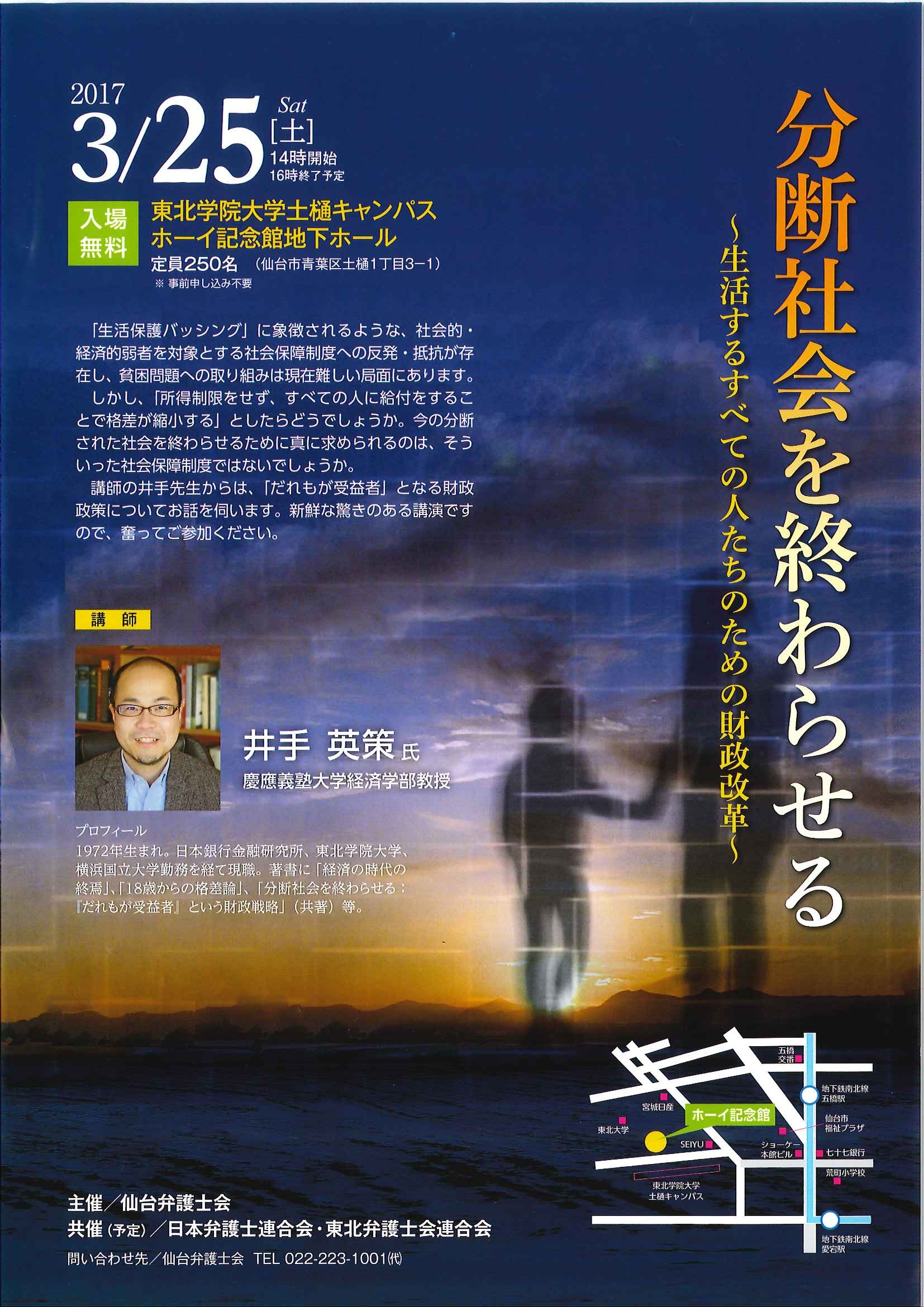 【講演会のお知らせ】分断社会を終わらせる~生活するすべての人たちのための財政改革~【日時:2017年3月25日(土)14時~16時 場所:東北学院大学土樋キャンパス ホーイ記念館地下ホール】 2017/01/30
