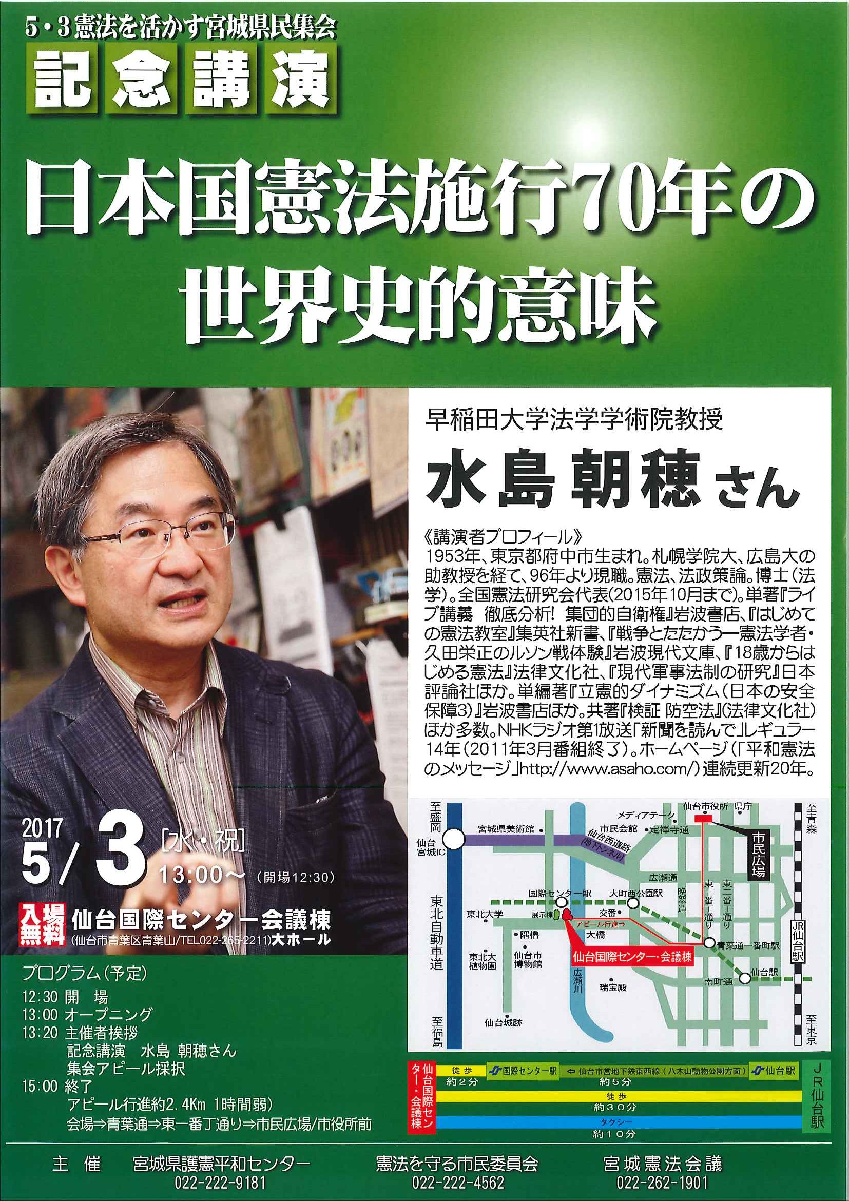 【集会・記念集会のお知らせ】5・3憲法を活かす宮城県民集会 記念講演 日本国憲法施行70年の世界史的意味【日時:2017年5月3日(水・祝)13:00~(12:30~開場) 場所:仙台国際センター会議棟大ホール】 2017/03/31