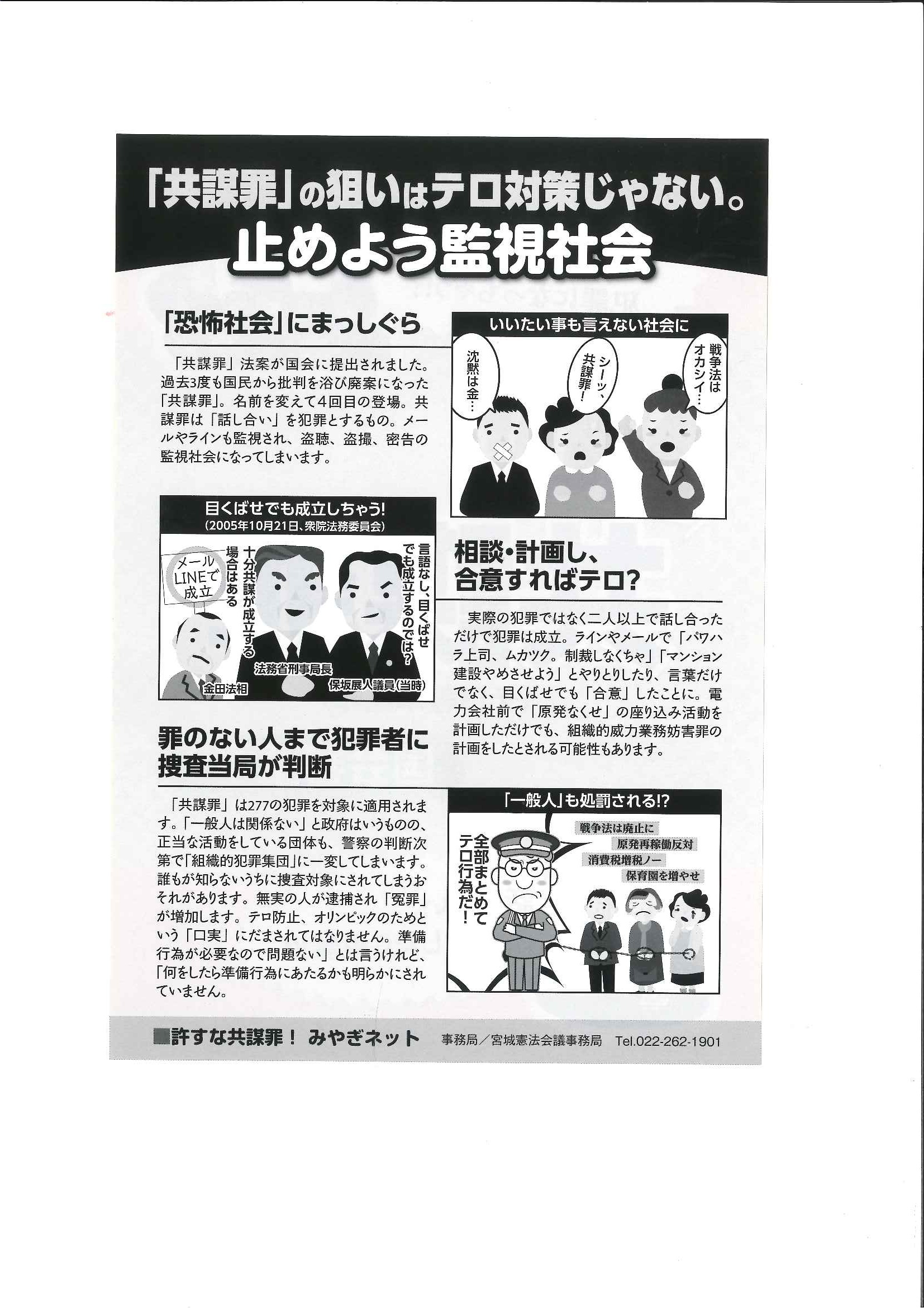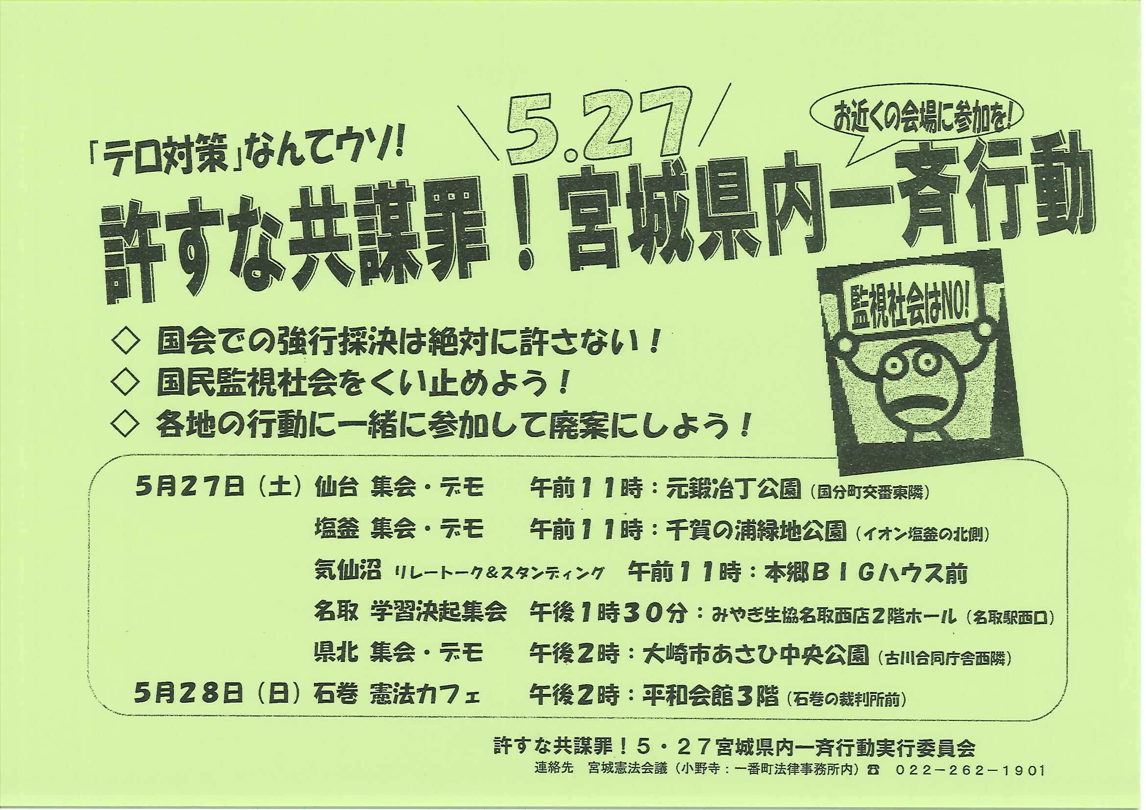 【集会・デモのお知らせ】許すな共謀罪!5・27宮城県内一斉行動【日にち:5月27日(土) 時間・場所:チラシ記載のとおり】 - 仙台 弁護士 一番町法律事務所