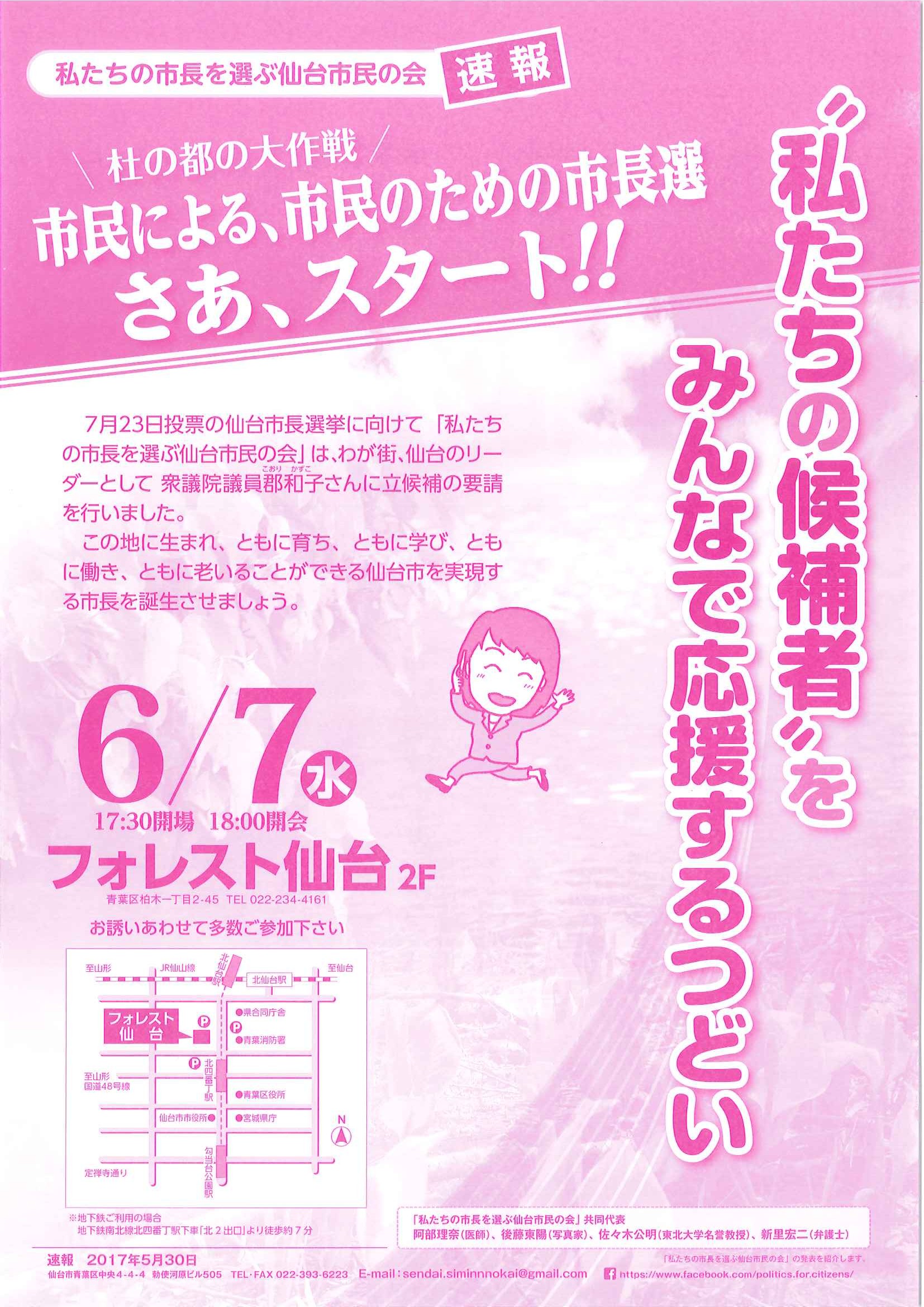 【集会のお知らせ】私たちの市長を選ぶ仙台市民の会 ’’私たちの候補者’’をみんなで応援するつどい【日時:6月7日(水)18:00~(17:30開場) 場所:フォレスト仙台2階】