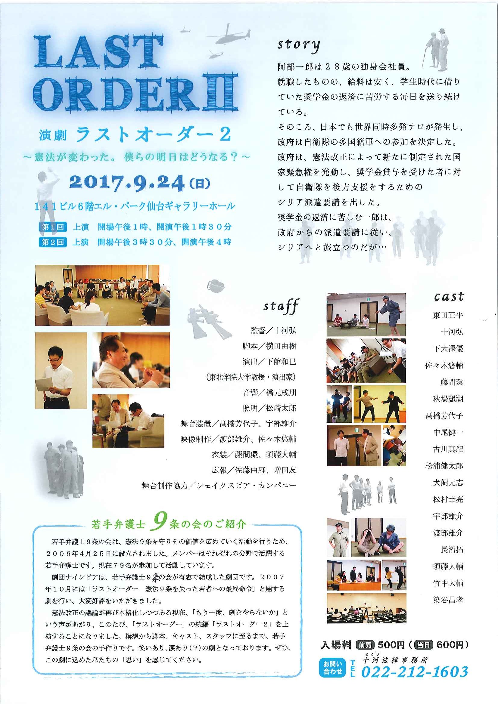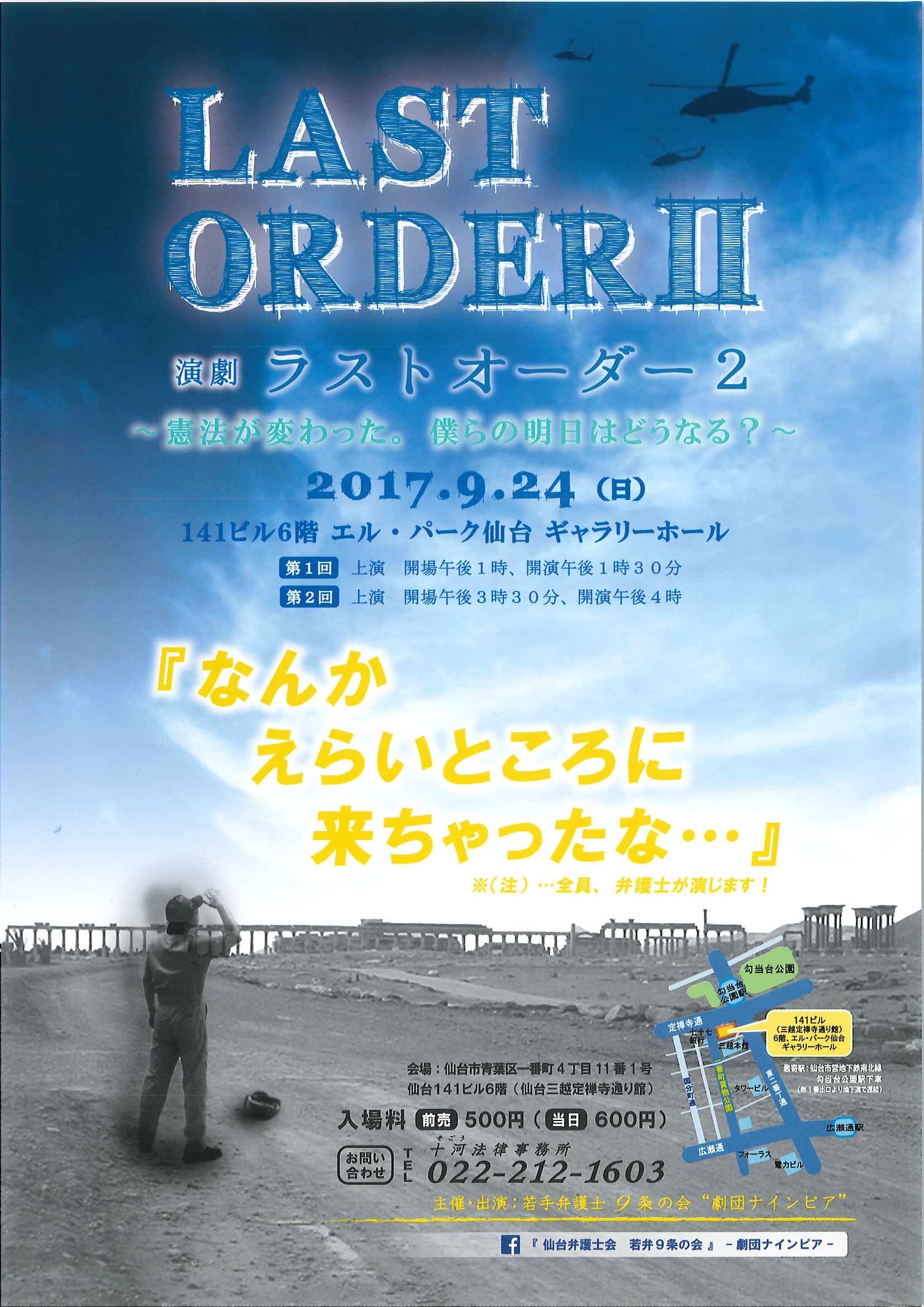 【演劇のご案内】演劇 ラスト・オーダー2~憲法が変わった。僕らの明日はどうなる?~【日時:2017年9月24日(日)第1回上映:開場午後1時、開演午後1時30分、第2回上映:開場午後3時30分、開演午後4時 場所:141ビル6階 エル・パーク仙台 ギャラリーホール】 2017/08/21