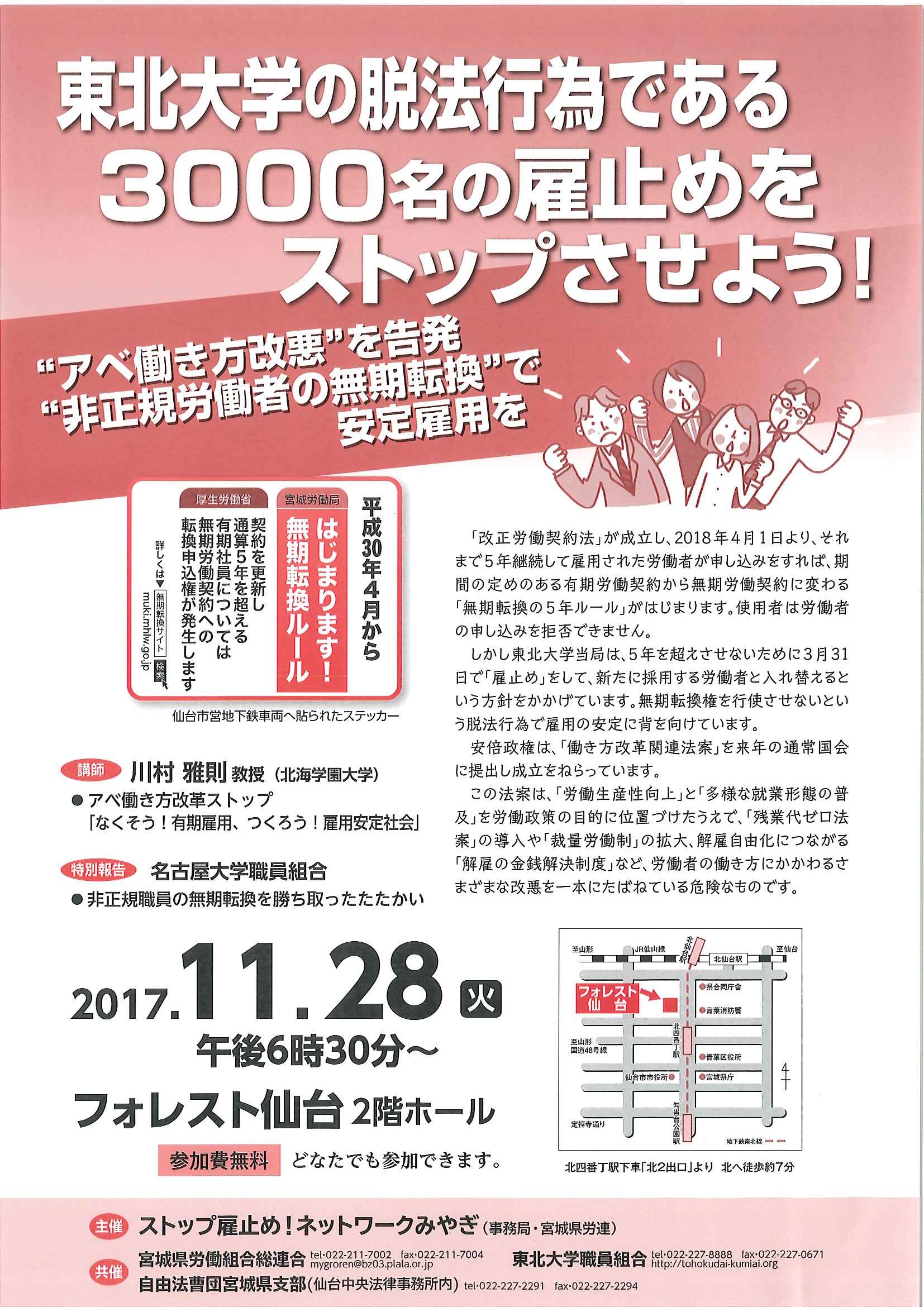 【シンポジウムのお知らせ】東北大学の脱法行為である3000名の雇止めをストップさせよう!【日時:2017年11月28日午後6:30~ 場所:フォレスト仙台2階】 - 仙台 弁護士 一番町法律事務所