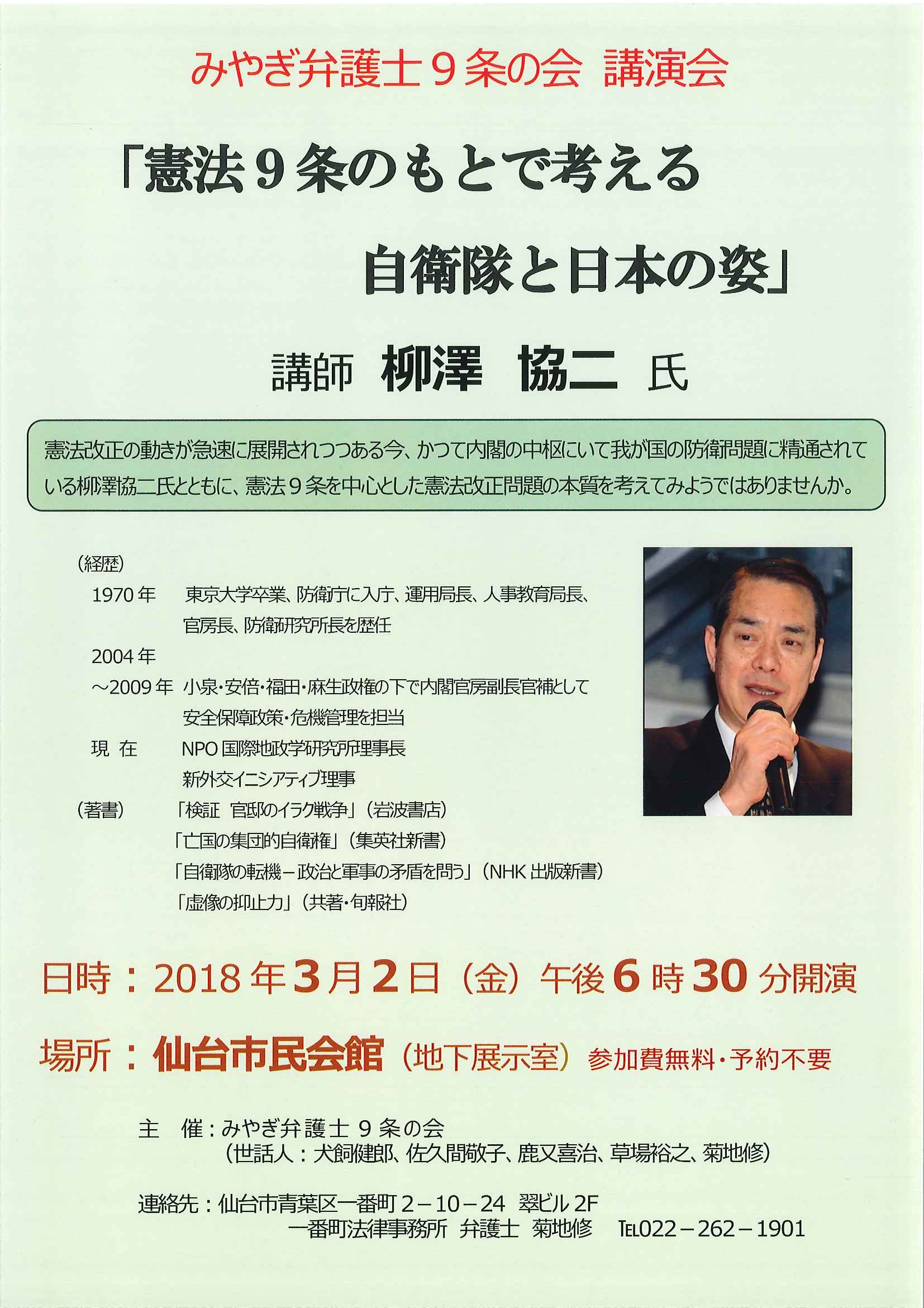【講演会のお知らせ】憲法9条のもとで考える自衛隊と日本の姿【日時:2018年3月2日午後6時30分~ 仙台市民会館(地下展示室)】 - 仙台 弁護士 一番町法律事務所