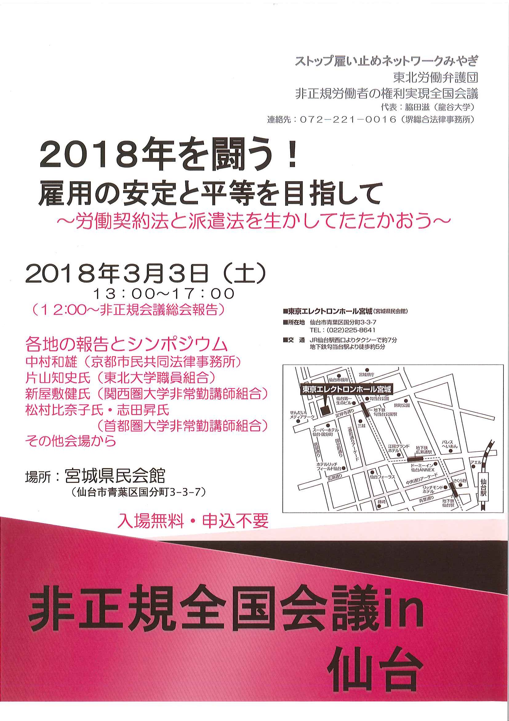 【シンポジウムのお知らせ】2018年を闘う!雇用の安定と平等を目指して~労働契約法と派遣法を生かしてたたかおう~【日時:2018年3月3日(土)13:00~17:00 場所:宮城県民会館(東京エレクトローンホール宮城)】 2018/02/28