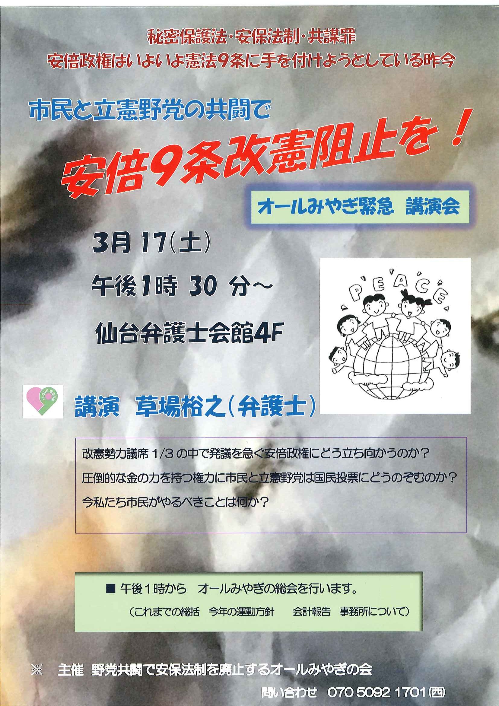 【講演会のお知らせ】市民と立憲野党の共闘で安部9条改憲阻止を!【日時:3月17日(土)13:30~ 場所:仙台弁護士会館4階】 - 仙台 弁護士 一番町法律事務所