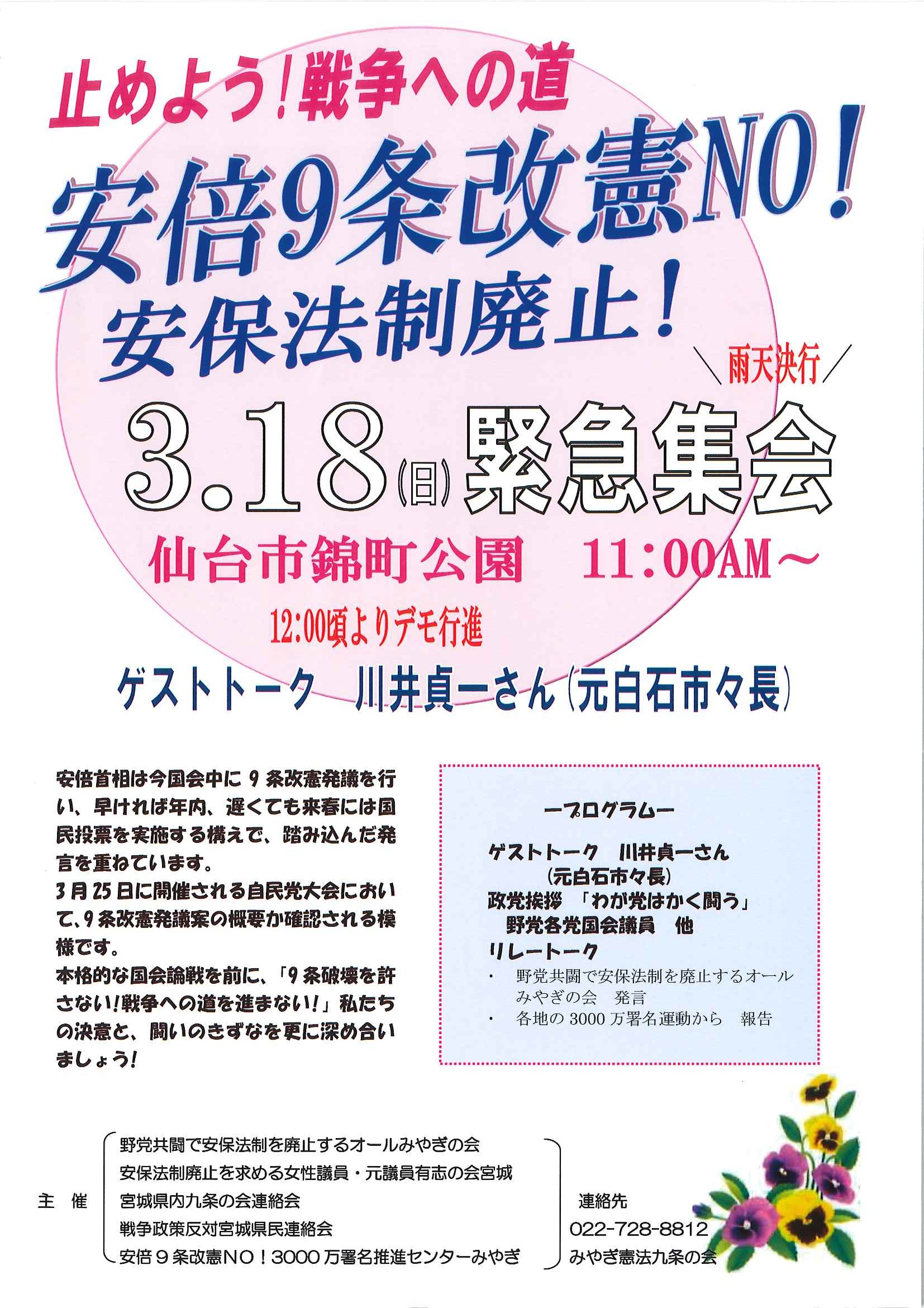 【集会のお知らせ】安部9条改憲NO!安保法制廃止!3.18緊急集会【日時:2018年3月18日(日)11:00~ 場所:仙台市錦町公園】 - 仙台 弁護士 一番町法律事務所