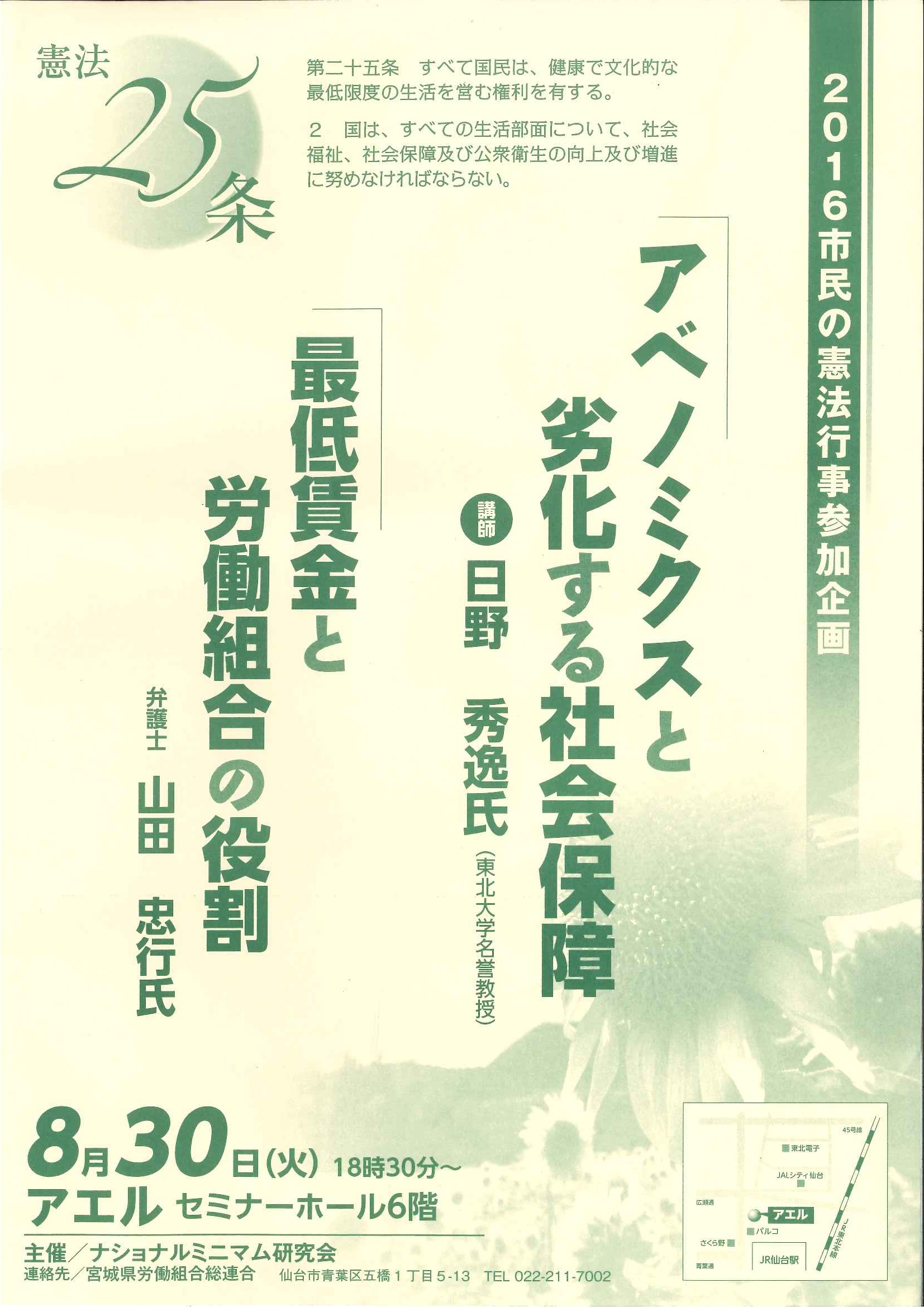 【講演会のお知らせ】「アベノミクスと劣化する社会保障」/「最低賃金と労働組合の役割」【8月30日(火)18:30~ アエルセミナーホール6階】