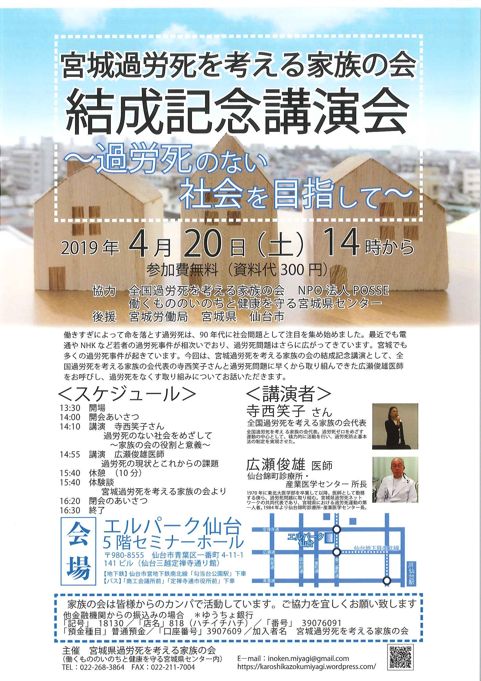 【講演会のお知らせ】宮城過労死を考える家族の会結成記念講演~過労死のない社会を目指して~【日時:2019年4月20日(土)14時~ 場所:エルパーク仙台5階セミナーホール】