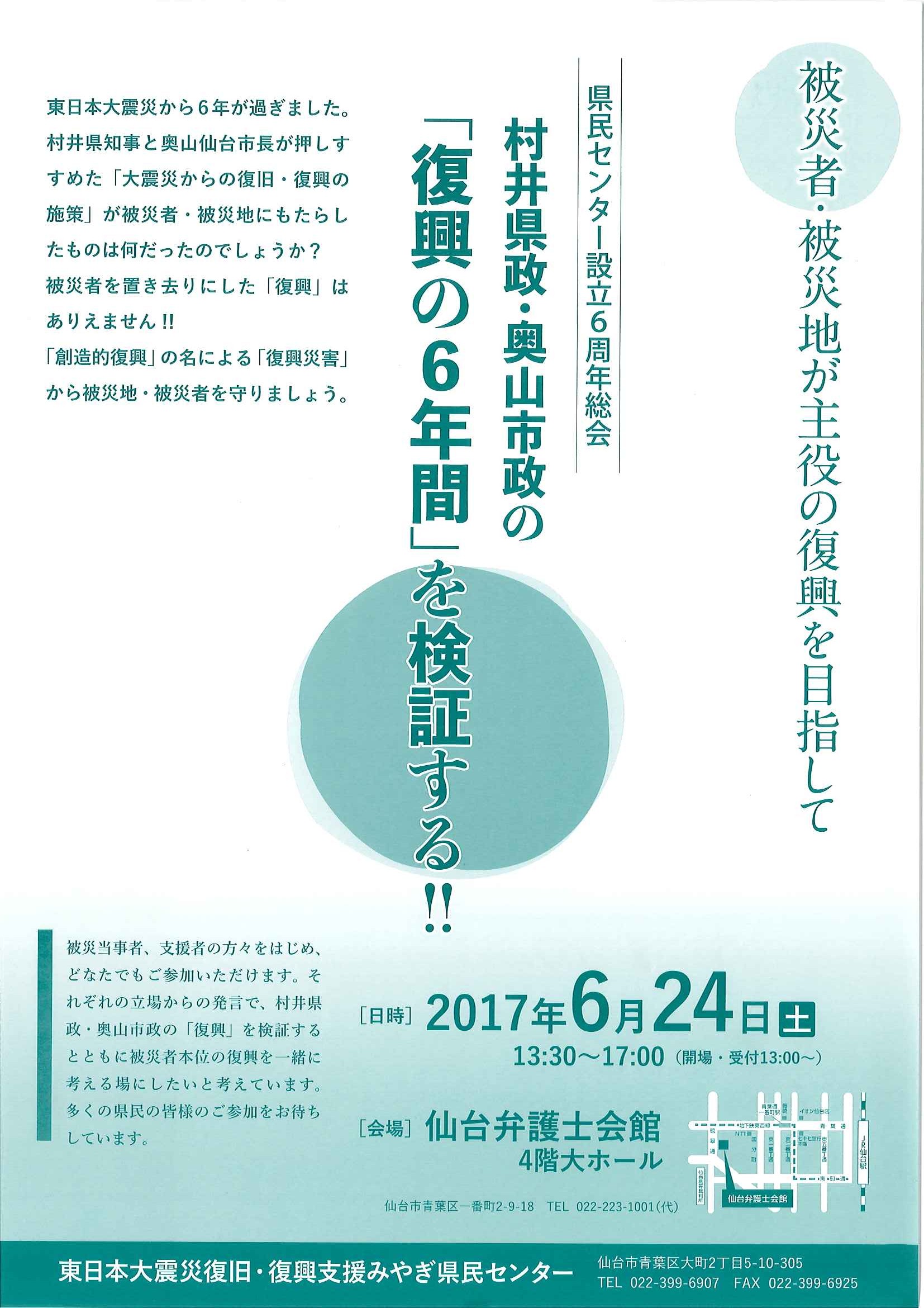 【シンポジウムのお知らせ】県民センター設立6周年総会 村井県政・奥山市政の「復興の6年間」を検証する!!【日時:2017年6月24日(土)13:30~17:00(受付13:00~) 場所:仙台弁護士会館4階大ホール】